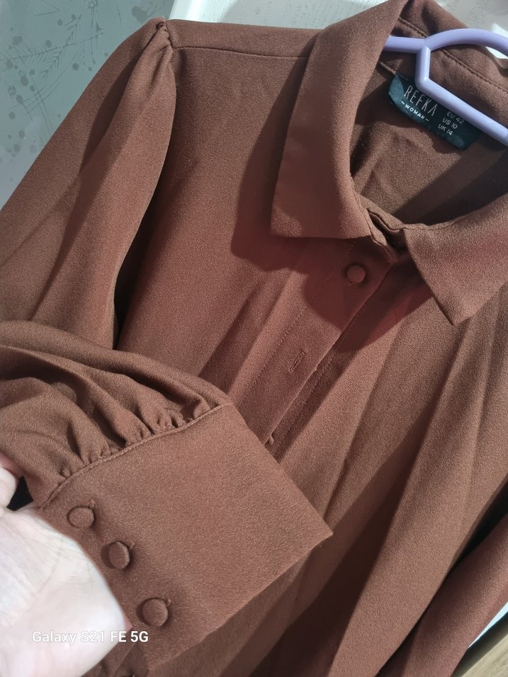 Kahverengi, düğmeli, yakalı ve uzun kollu kadın bluz ve beli lastikli pantolon. İpeksi dokusu ve parlak görünümüyle ofis için uygun, normal boyda ve regular fit.