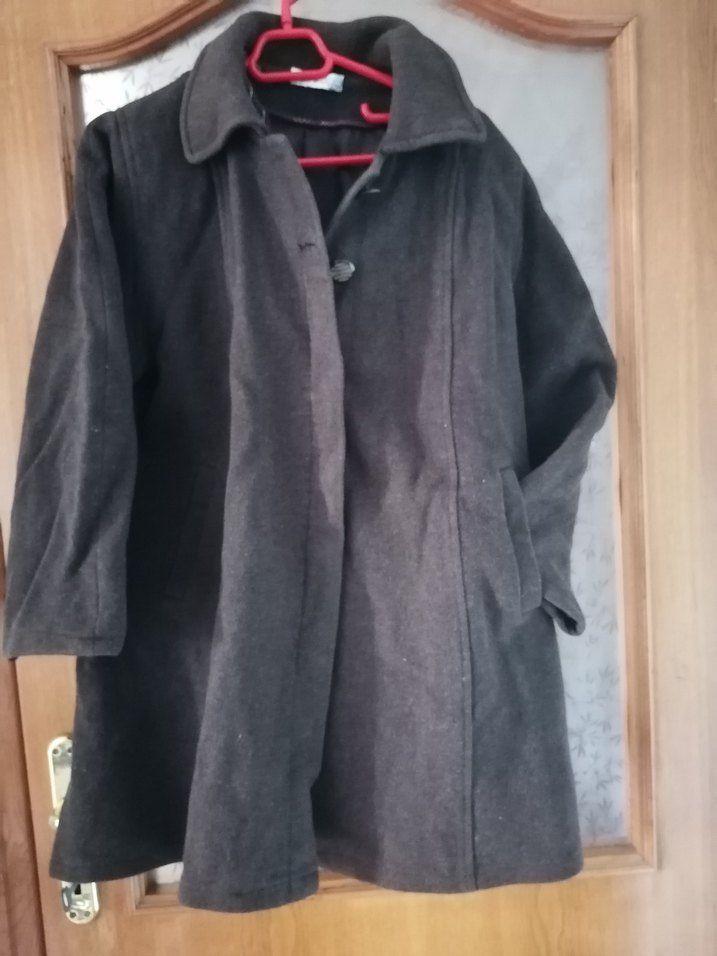 Düğmeli,kolları bilegi biraz geciyor yani kısa , klasik yakalı kahverengi kaban. Rahat bol kesim ve yan ceplere sahiptir.