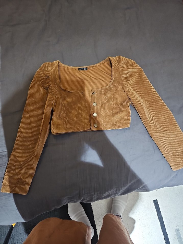 Düğmeli, kahverengi kadife kumaştan yapılmış, uzun kollu ve yuvarlak yakalı, günlük kullanıma uygun, vücuda oturan bir bluz. hic bir kusuru yoktur