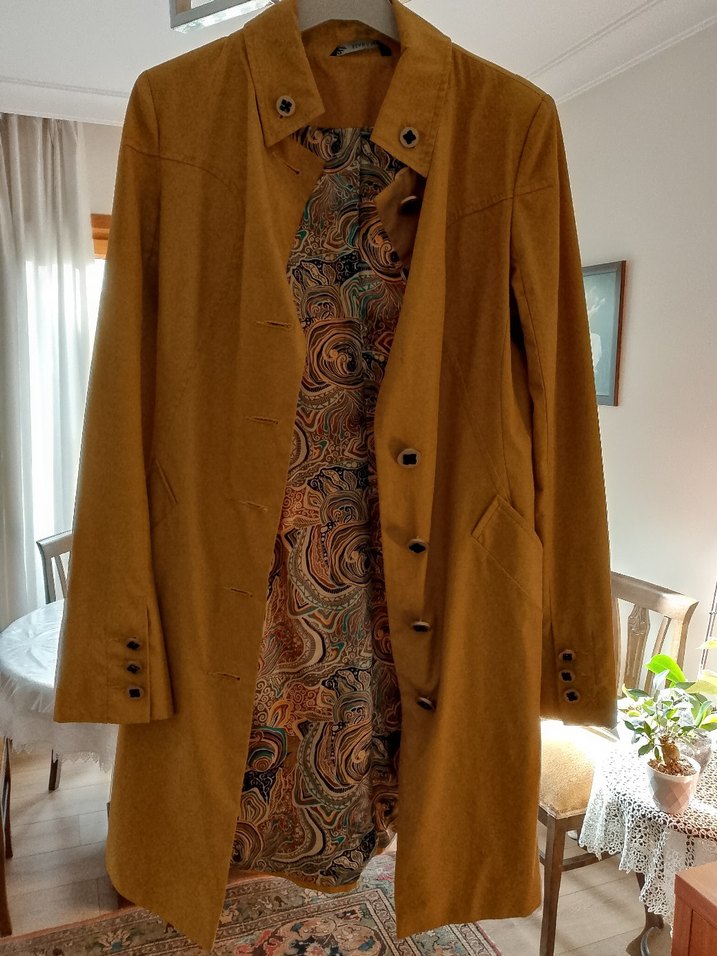Uzun kahverengi kadife hamile kabanı, düğmeli ve kesik yakalıdır. Bol kesim ve uzun kollu, günlük kullanıma uygun bohem vintage tarzındadır. ✨