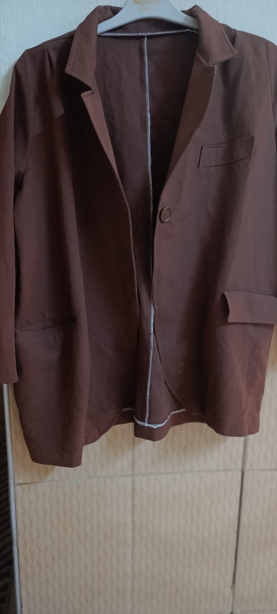 Düğmeli, kahverengi kadın blazer, kesik yakalı ve uzun kolludur. Keten kumaştan, normal boyda ve günlük kullanıma uygundur.