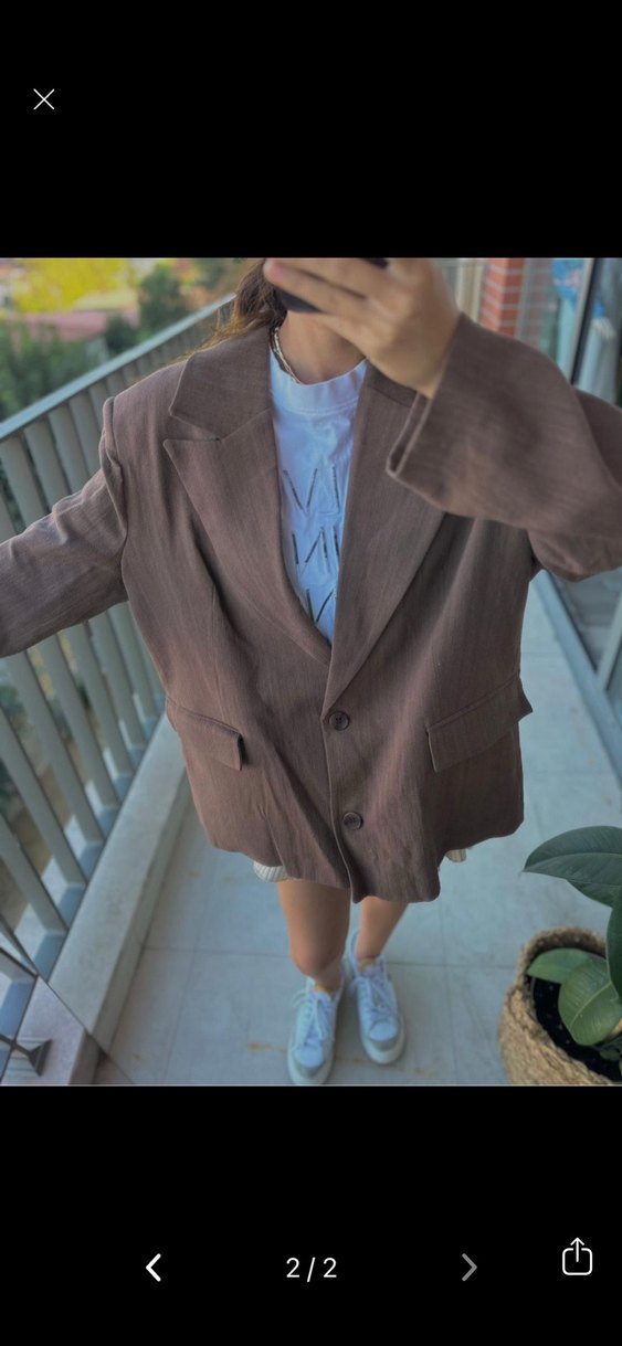 Kahverengi keten kumaştan, düğmeli ve kruvaze yakalı, uzun kollu kadın blazer ceket. Günlük sokak stiline uygun, rahat kesim.