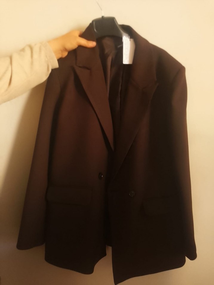 Kahverengi kadın blazer, düğmeli, uzun kollu ve normal kesimdir. Sentetik kumaştan yapılmış, ofis için uygun sade ve desensiz tasarıma sahiptir.