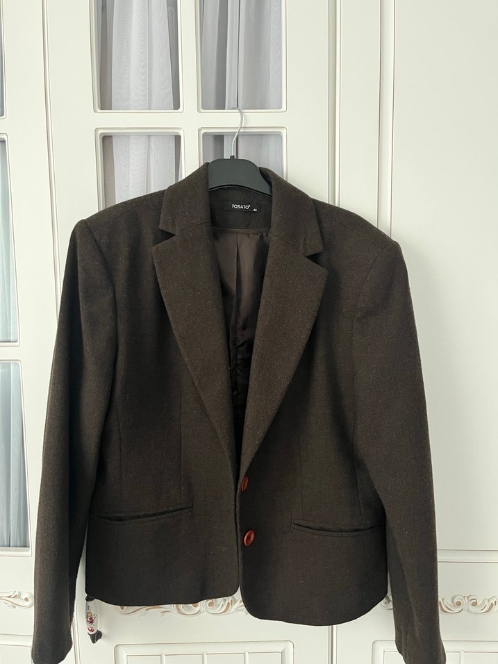 Kahverengi yün kumaştan, düğmeli ve kesimli yakalı kadın blazer. Uzun kollu, normal boy midi kesim, iş ortamına uygun.