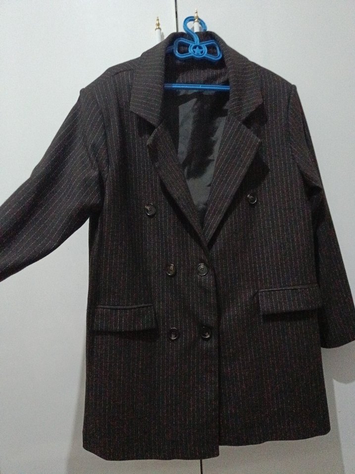 Kahverengi yün kumaştan, düğmeli, notalı yakalı, uzun kollu normal midi uzunluğunda kadın blazer ceket. Ofis ve trend sokak stili için uygundur.