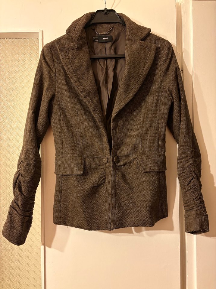 Düğmeli, kahverengi kadın ceket, keten kumaştan, normal uzunlukta ve uzun kollu. Ofis ortamına uygun, rahat kesim ve kesik yaka detaylı. Ceket çok şık kalın bir ceket.ürün 38 beden yazıyor ama dar biraz 36 beden birine uygun