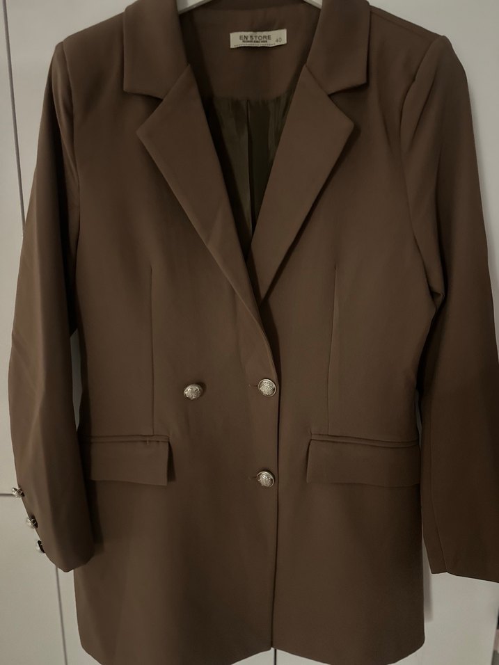 Düğmeli ve klasik yaka detaylı kahverengi kadın blazer, sentetik kumaştan üretilmiştir. Ofis için uygun, midi boy ve uzun kolludur. Modern klasik tarzda, iş ortamına şık uyum sağlar.