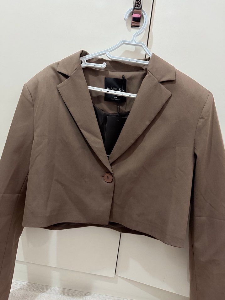 Kahverengi düğmeli kadın blazer, uzun kollu ve crop. Notched lapel yakaya sahip, iş ve günlük sokak stiline uygun.
