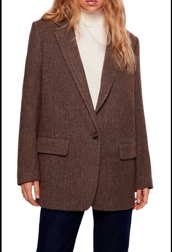 Kahverengi düğmeli kadın blazer ceket, yün kumaştan, normal kesim, uzun kollu ve midi boydadır. Ofis ve günlük kullanıma uygundur, desen içermemektedir.