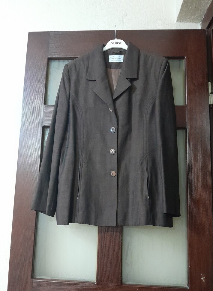 Düğmeli ön kısmı ve notlu yaka detayına sahip kahverengi blazer ceket. Uzun kollu, ipeksi dokulu ve normal boyda, ofis kullanımı için uygundur.