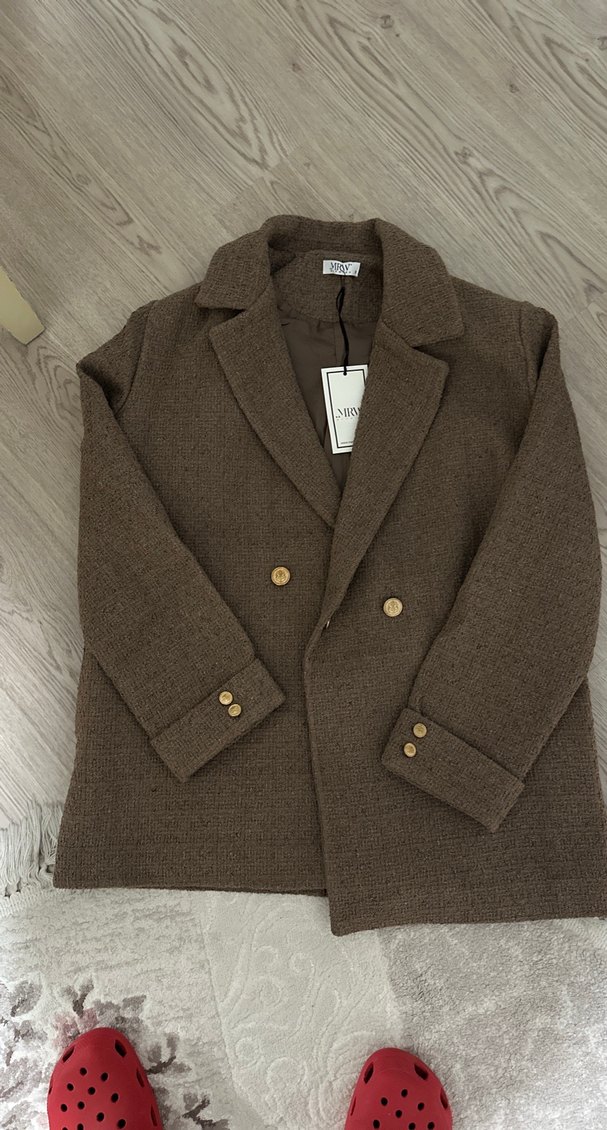 Kahverengi yün ceket, düğmeli ve kesik yakalıdır. Uzun kollu, normal kesim ve midi boydadır. Günlük kullanıma uygun, sade ve rahat stil sunar. Merwish marka, 2 beden