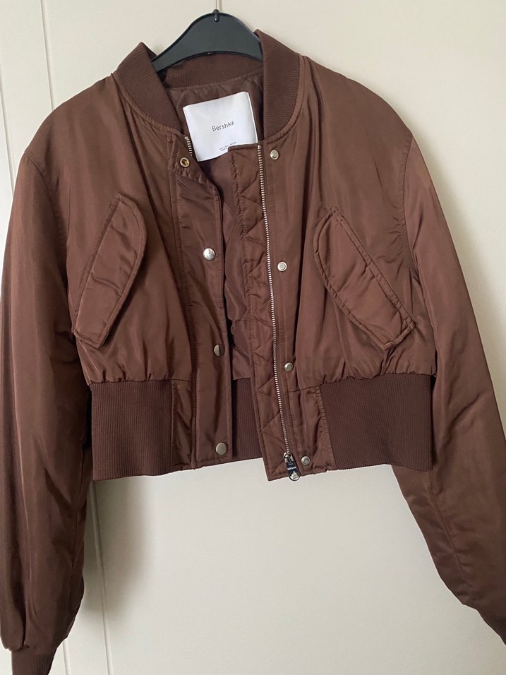 Düğmeli, uzun kollu, kahverengi kadın ceket. Normal midi boyda, oturan kesim ve yakası kesik detaylıdır. Sentetik kumaştan üretilmiştir.