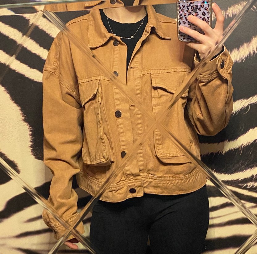 Kahverengi deri kadın denim ceket, düğmeli ve bol kesimdir. Notlu yakası ve uzun kolludur, günlük rahat kullanım için uygundur.