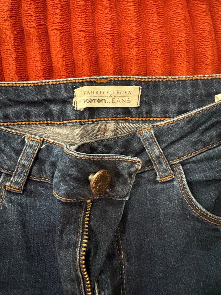 Düğmeli kahverengi denim pantolon, baskılı desenli ve vücuda oturan kesim. Günlük kullanıma uygun normal boyda, Koton Jeans markası.