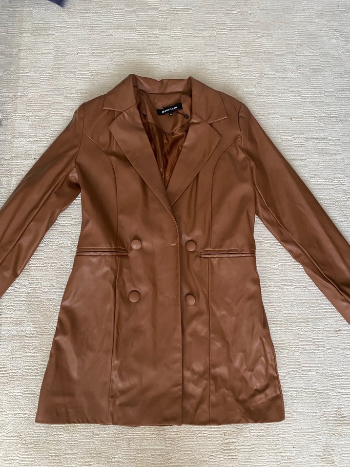Bu kahverengi deri ceket parlak bir görünüme, yaka ve düğme detaylarına sahiptir. Normal kesim ve uzun kolludur, iş ya da günlük kullanıma uygundur.
