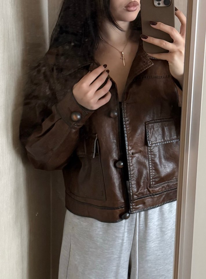 Düğmeli, yakalı ve uzun kollu kahverengi deri ceket. Salaş kesim ve midi boy, rahat sokak stili için uygun.