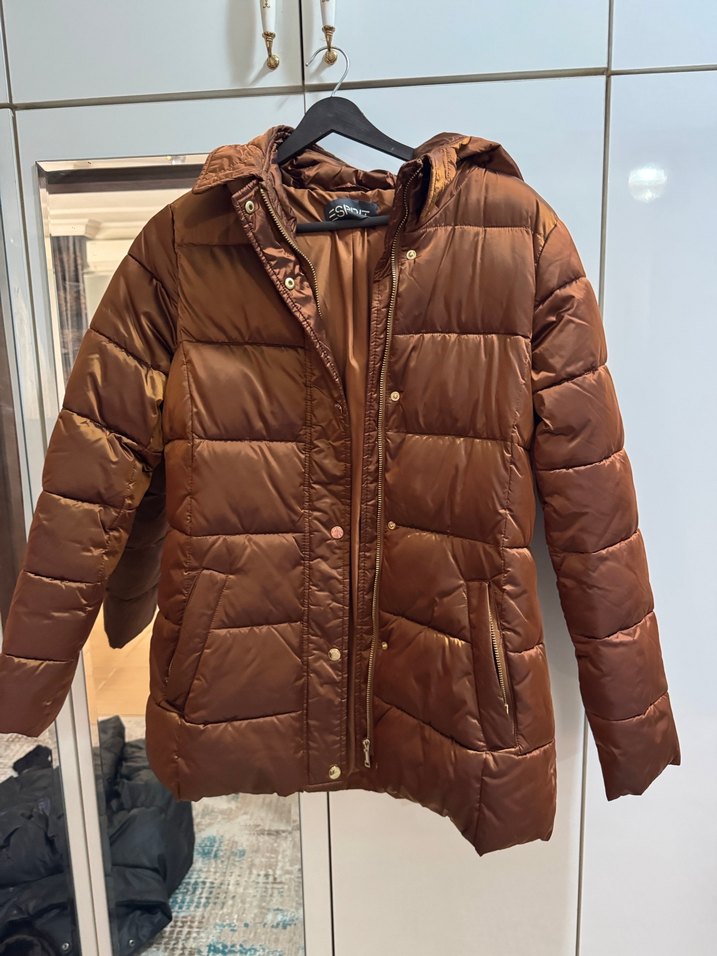Kahverengi, parlak deri kumaştan yapılmış, düğmeli ve vücuda oturan kesime sahip kadın kışlık mont. Uzun kollu ve yakası kesik detaylı, rahat ve şık sokak stili için uygun.