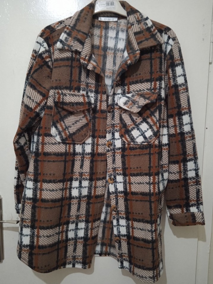 Uzun kollu, düğmeli kahverengi gömlek, yumuşak ve sıcak kumaştan yapılmış, salaş kesimli, kareli desenli, rahat sokak stili için uygundur.