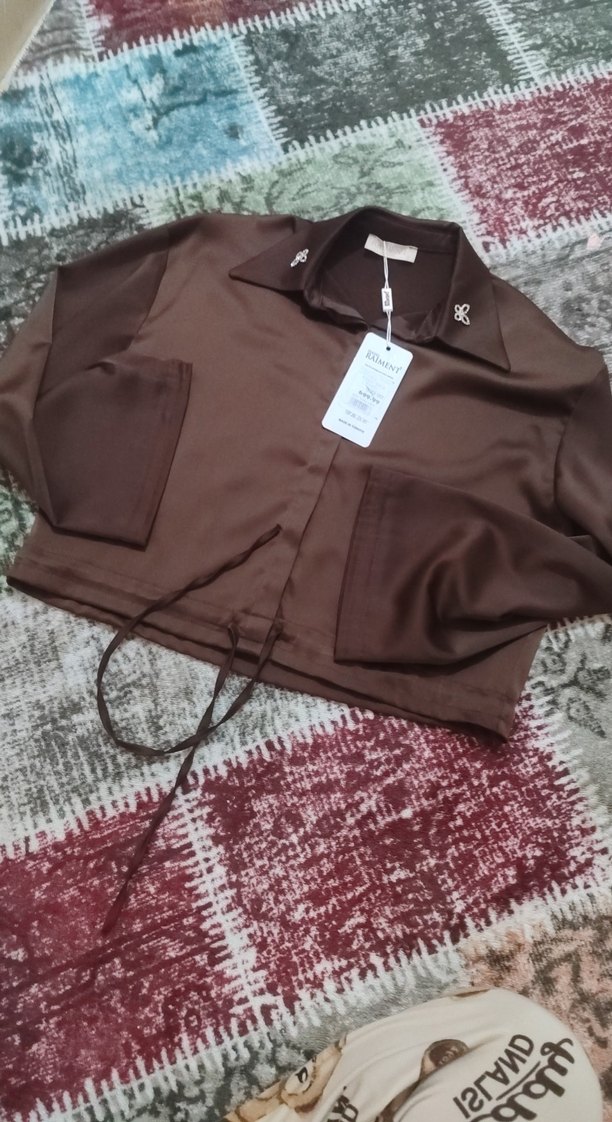Kahverengi, uzun kollu, yakalı ve düğmeli kadın gömleği. Rahat kesimli ve sentetik kumaştan üretilmiştir. Günlük sokak stili için uygundur.