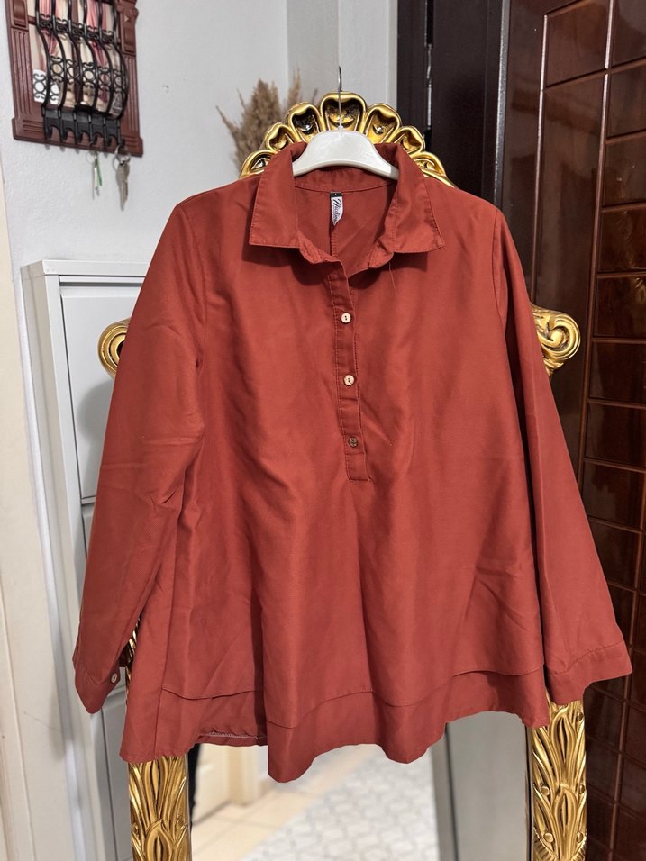 Düğmeli, yakalı, uzun kollu, bol kesim, kahverengi gömlek. Parlak kumaşıyla günlük rahat ve trend bir tarz sunar. Bol kesimdir hamileler emziren annelerde rahatlıkta tercih edebilirler