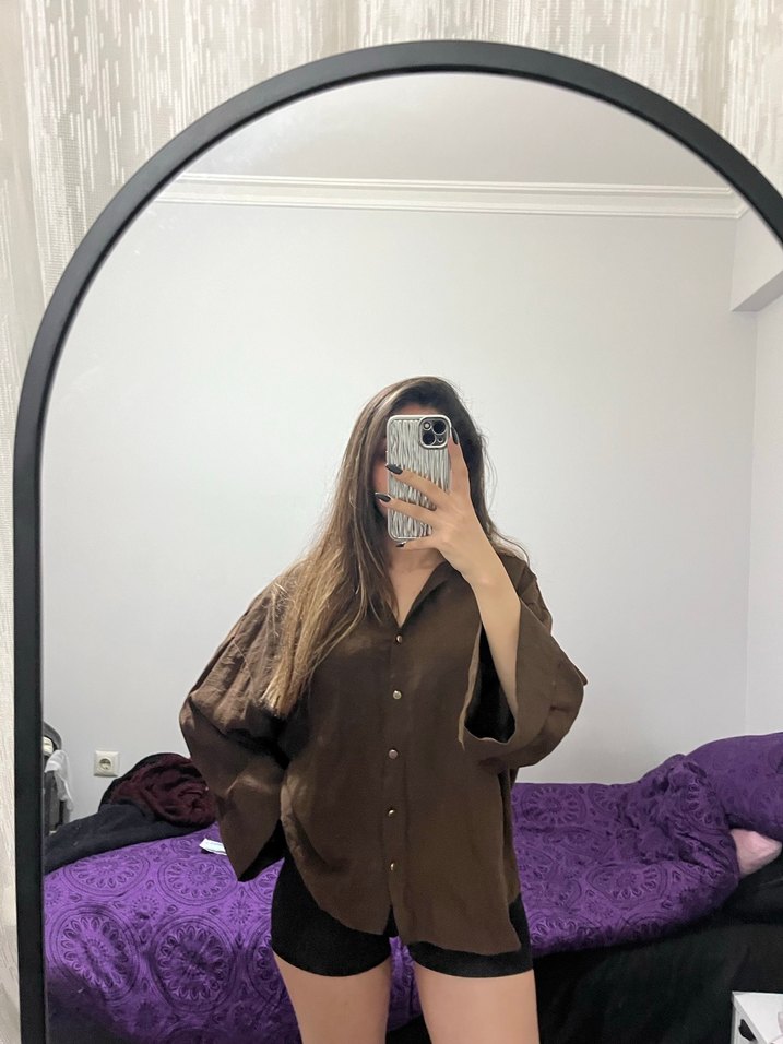 Kahverengi, düğmeli, yakalı ve uzun kollu kadın gömleği. Rahat kesim ve ipeksi dokuda, günlük kullanım için uygun.