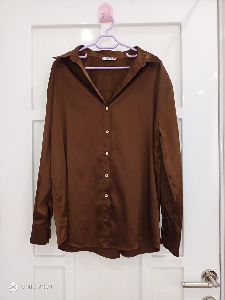 Kahverengi, düğmeli, yakalı ve uzun kollu kadın gömleği. İpeksi kumaştan, bol kesim ve normal midi boyda, minimalist normcore tarzında.