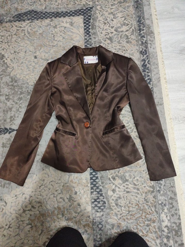 Kahverengi, düğmeli, normal uzunlukta kadın blazer ceket. Notch yakalı, uzun kollu, düz ve saten kumaştan, ofis kullanımına uygun.