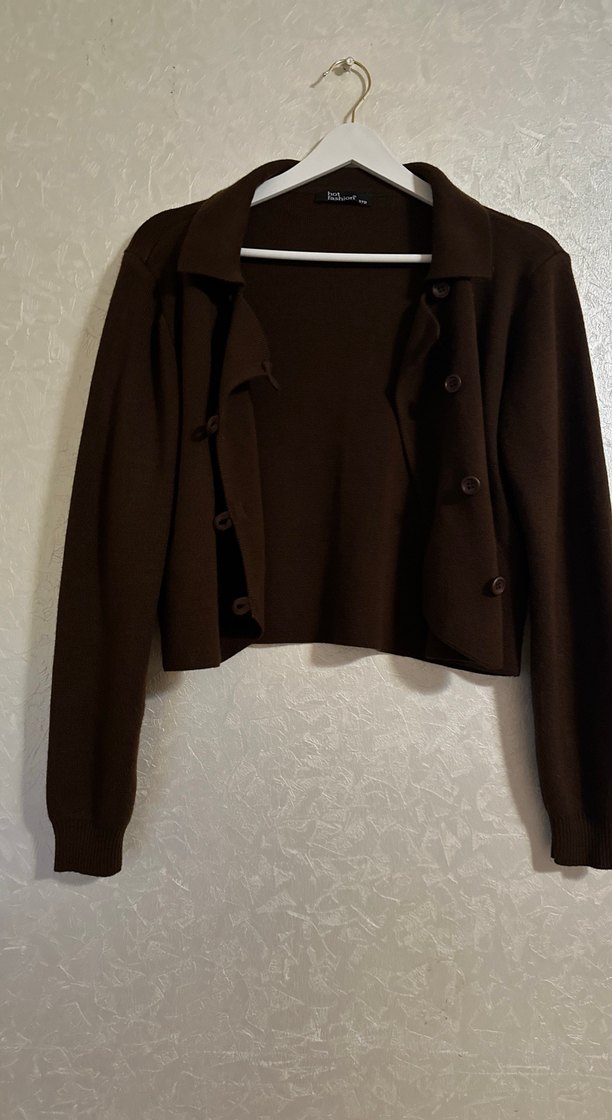 S/M uyumlu , Düğmeli, uzun kollu, kahverengi fitted hırka. Yün kumaştan, notched lapel yakalı, midi boy, minimalist ve normcore tarzda günlük kullanıma uygun.