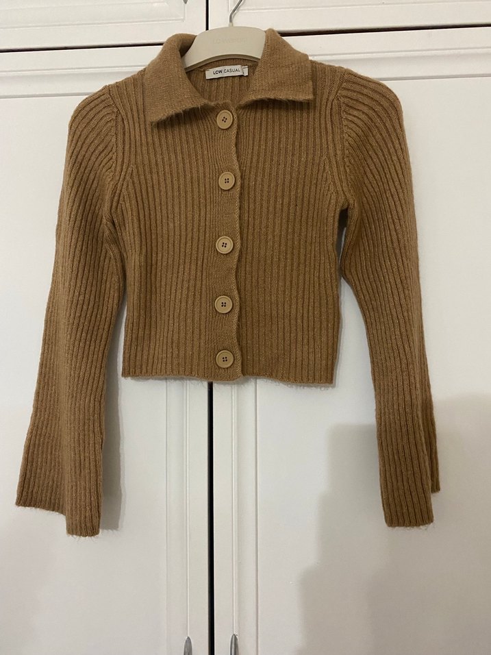 Düğmeli, kahverengi triko hırka, uzun kollu ve kruvaze yaka detaylıdır. Normal midi boyda, rahat ve desensiz tasarıma sahiptir.