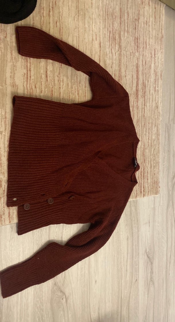 Düğmeli, uzun kollu, kahverengi yün hırka. Notlu yaka ve normal boyda, rahat normcore tarzda, günlük kullanım için uygundur.