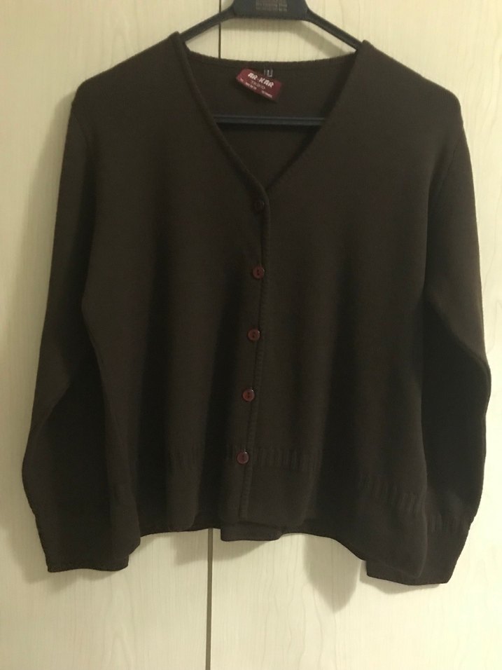 Kahverengi yün hırka, uzun kollu, düğmeli ve yuvarlak yakalıdır. Rahat kesimi ve normal midi boyuyla günlük kullanıma uygundur. 1 beden. Ölçüsü göğüs 52 cm boyu 53 cm