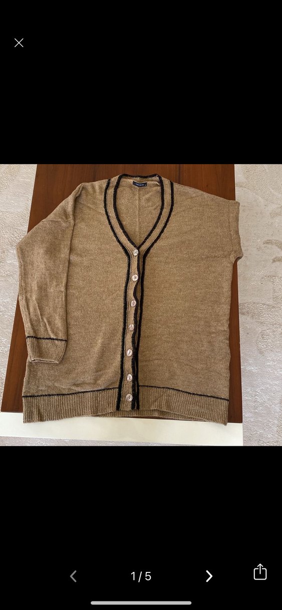 Kahverengi örme hırka, uzun kollu ve düğmeli.V yaka ve bol kesim ile günlük kullanıma uygun midi boyda.