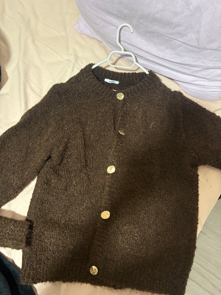 Kahverengi, düğmeli, yuvarlak yakalı, uzun kollu, bol kesim, midi uzunlukta örme kadın hırka. Rahat ve şık bir günlük tercih.