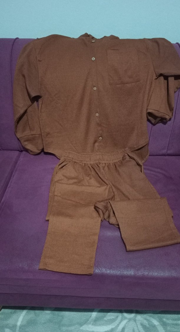 düğmeli ve uzun kollu olup, gevşek ve rahat bir kesime sahiptir. Kahverengi