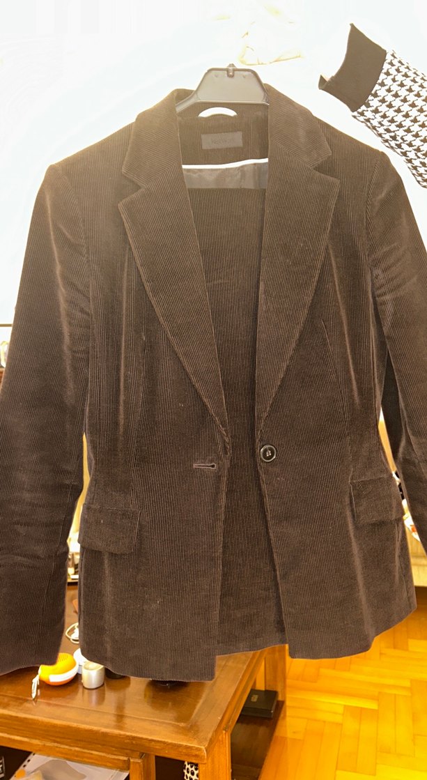 Düğmeli, kahverengi süet blazer ceket, klasik kesim, uzun kollu ve midi boydadır. Ofis kullanımı için uygundur.