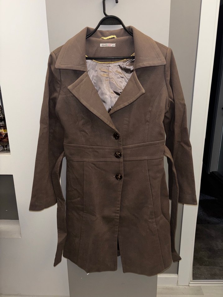 Düğmeli, kahverengi gri tonlarında, kaşe kumaştan yapılmış kadın kaban. Normal boy, uzun kollu ve regular fit kesime sahip, ofis ve günlük kullanıma uygun.