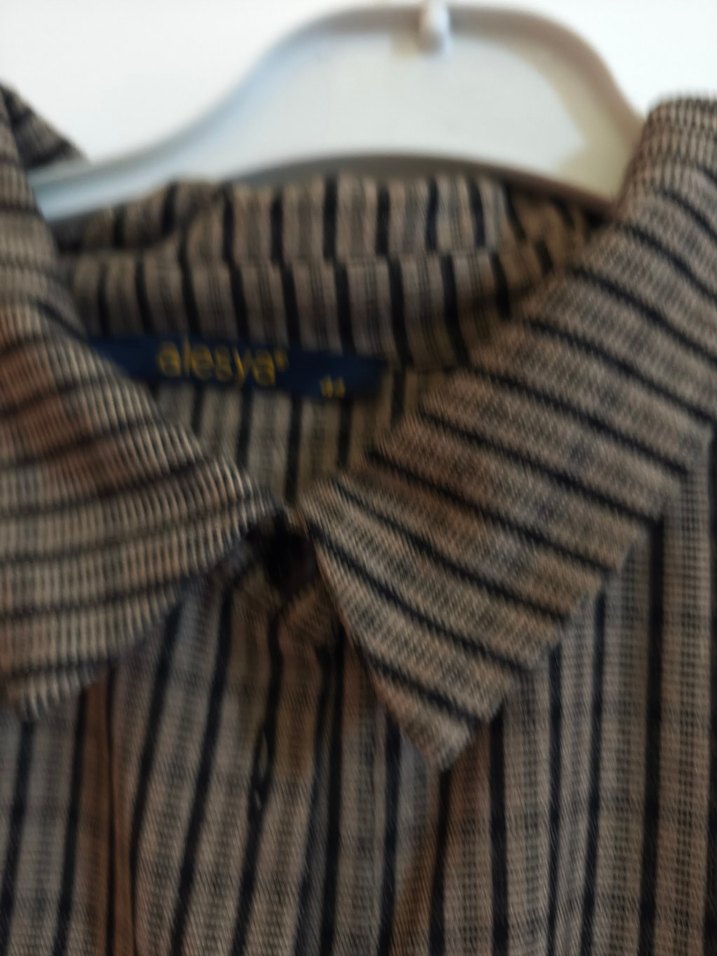 Uzun kollu, düğmeli ve keten kumaştan yapılmış kahverengi ve gri tonlarında baskılı, bol kesim kadın gömlek. Notched lapel yaka ve günlük sokak stili için uygun.