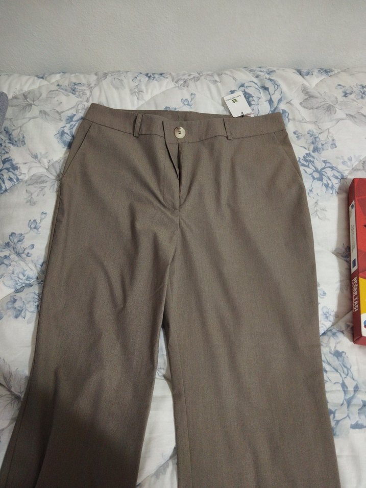 Kahverengi keten kumaştan, düğmeli, normal boy midi kesim, düz desenli kadın pantolonu. Ofis kullanımı için uygundur.