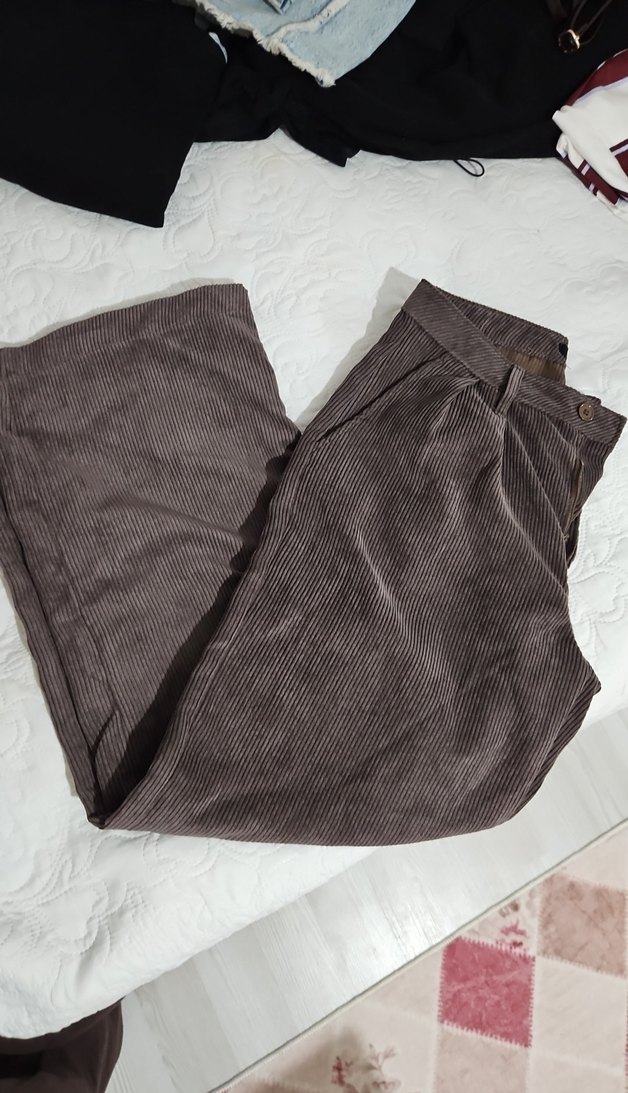 Düğmeli kahverengi keten pantolon, bol kesim, midi boy, günlük normcore tarzda rahat kullanıma uygundur.