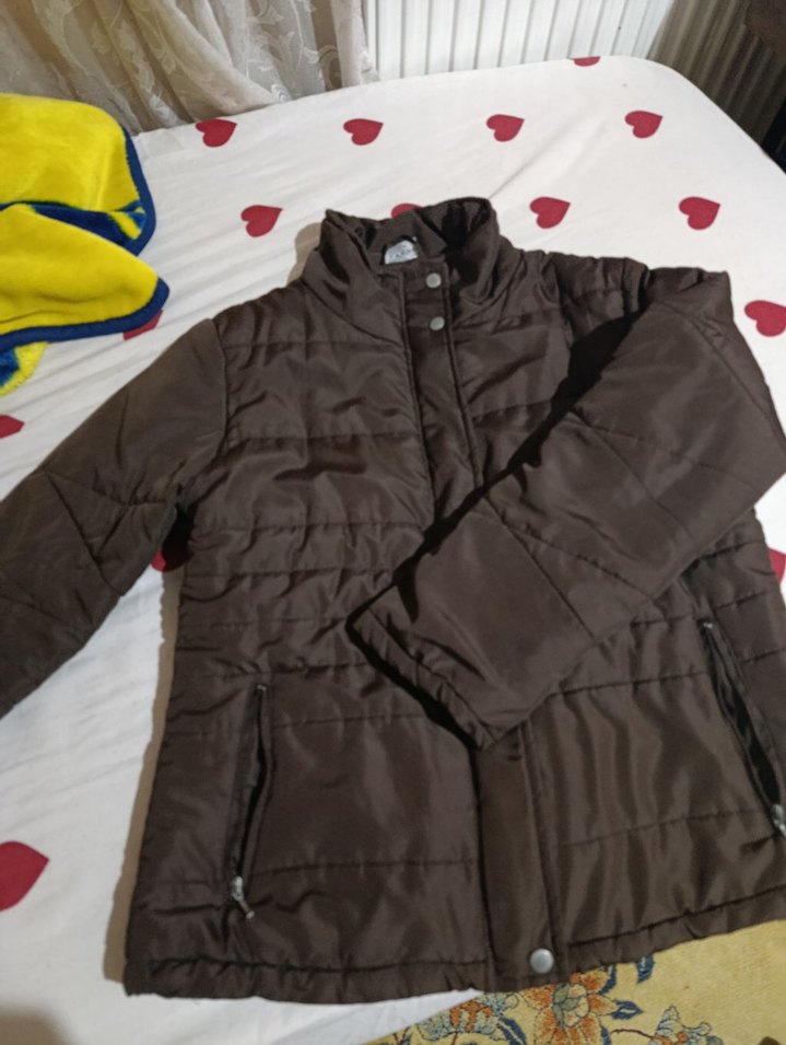 Düğmeli, kahverengi kış montu, boğazlı yaka ve uzun kolludur. Orta boy ve yumuşak, sıcak tutan fleece kumaştan yapılmıştır.