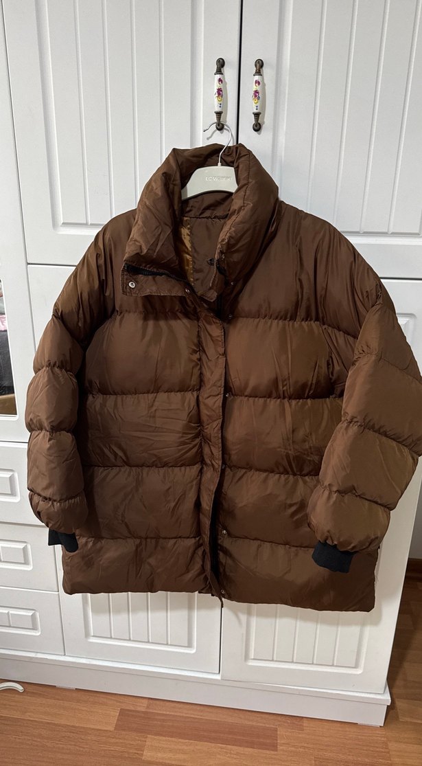 Kahverengi, düğmeli, yumuşak ve sıcak kumaştan yapılmış, uzun kollu, normal uzunlukta ve bol kesim kadın kışlık mont.marka temsili