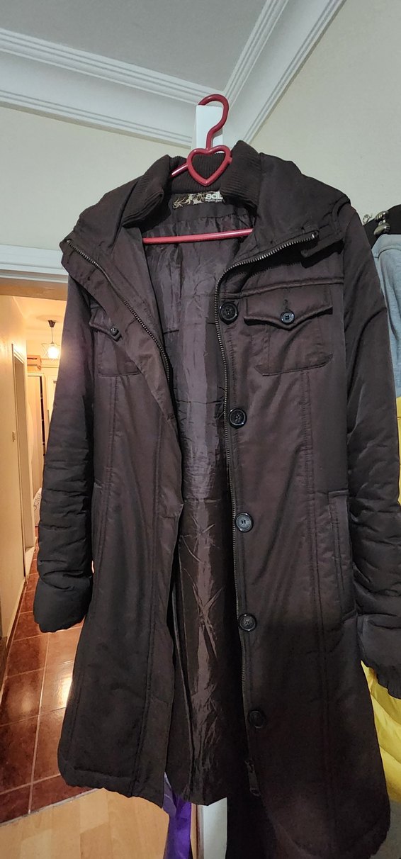 Düğmeli, yakalı ve uzun kollu kahverengi kadın kışlık ceket. Sentetik kumaştan, normal midi boyda, sokak stiline uygun ve günlük kullanıma elverişli.