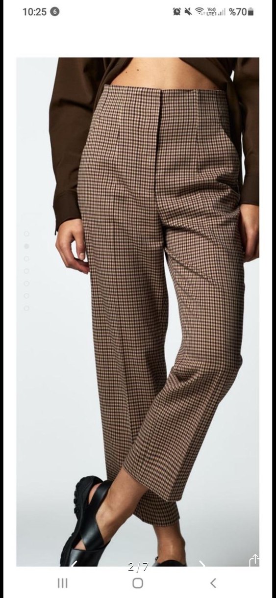 Düğmeli ve midi boy kahverengi kadın kumaş pantolon, sentetik kumaştan üretilmiş, ofis ve günlük kullanım için uygun.