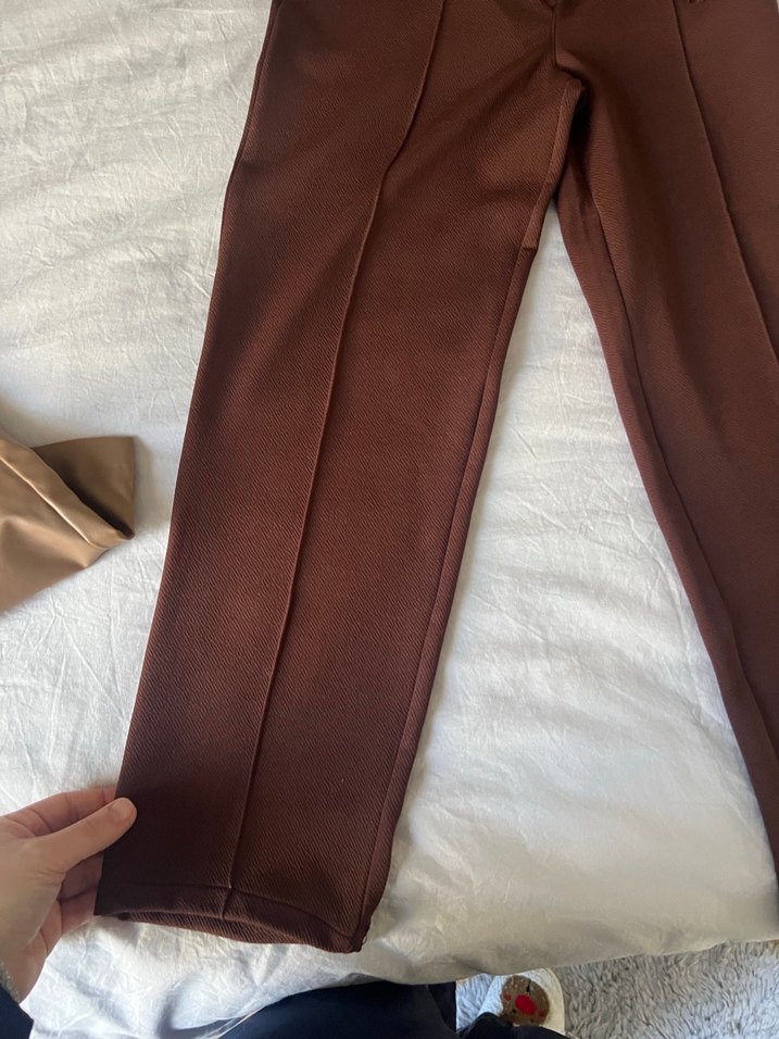 Düğmeli, kahverengi kadın kumaş pantolon, regular fit ve midi boy. Düz ve parlak sentetik kumaştan, minimalist sokak stili için uygun.