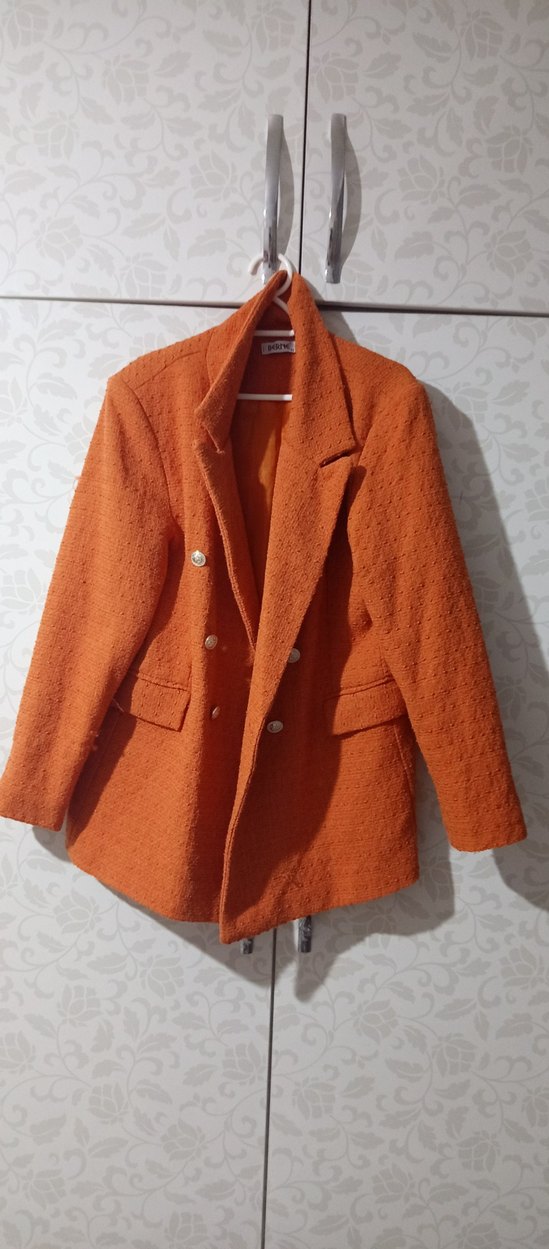 Düğmeli, kahverengi kadın blazer, yün kumaştan. Normal boy, regular fit ve uzun kolludur. Ofis kullanımı için uygundur. ✨