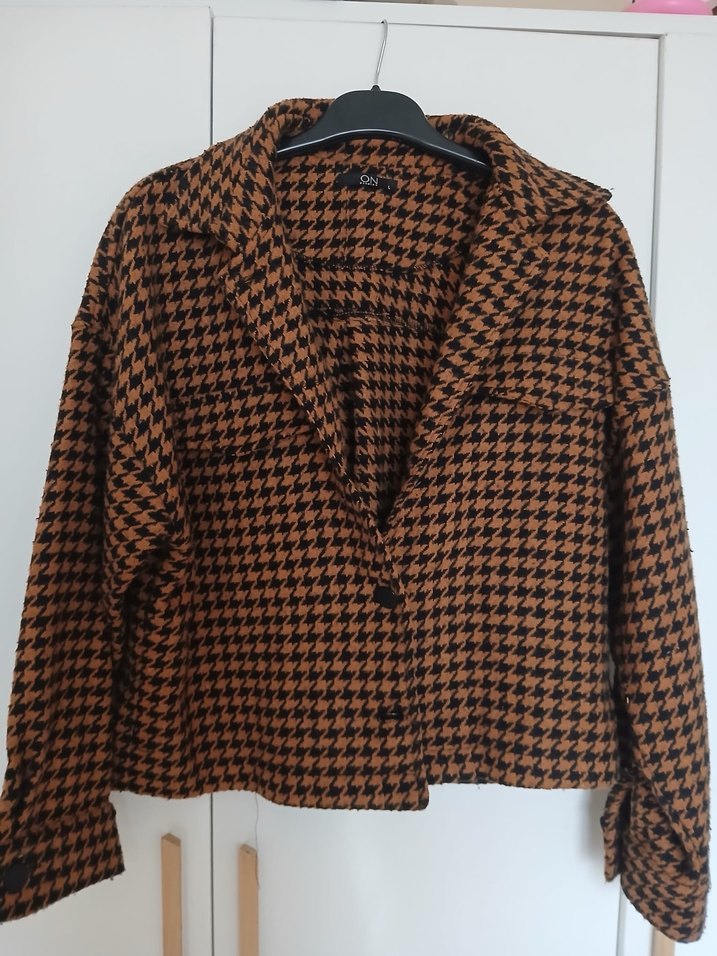Düğmeli, kahverengi yün kumaştan, uzun kollu, normal boy midi ceket. Rahat kesimi ve keskin yakası ile ofis şıklığı sağlar.