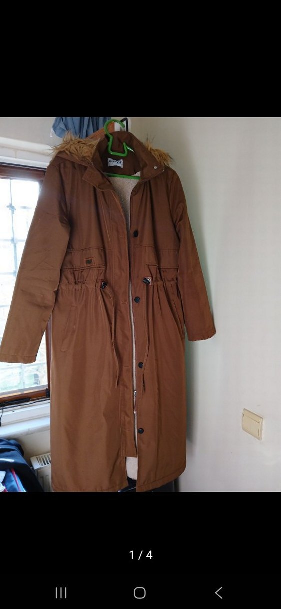 Düğmeli ön kısmı ve bol kesimiyle kahverengi uzun kadın montu. Notlu yaka ve uzun kolludur, yumuşak ve sıcak kumaştan yapılmıştır. Parlak kahverengi rengi sokak modasına uygundur.