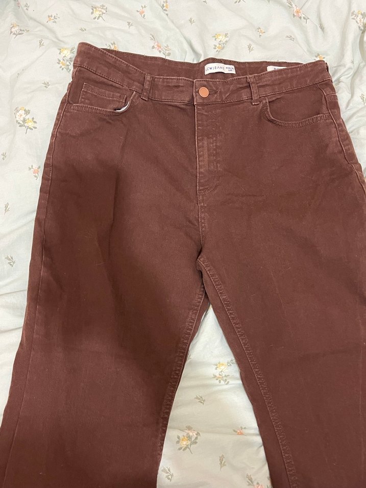 Düğmeli, normal boy ve bol kesim kahverengi kadın pantolon. Pamuk kumaştan üretilmiş, günlük rahat kullanım için uygundur.