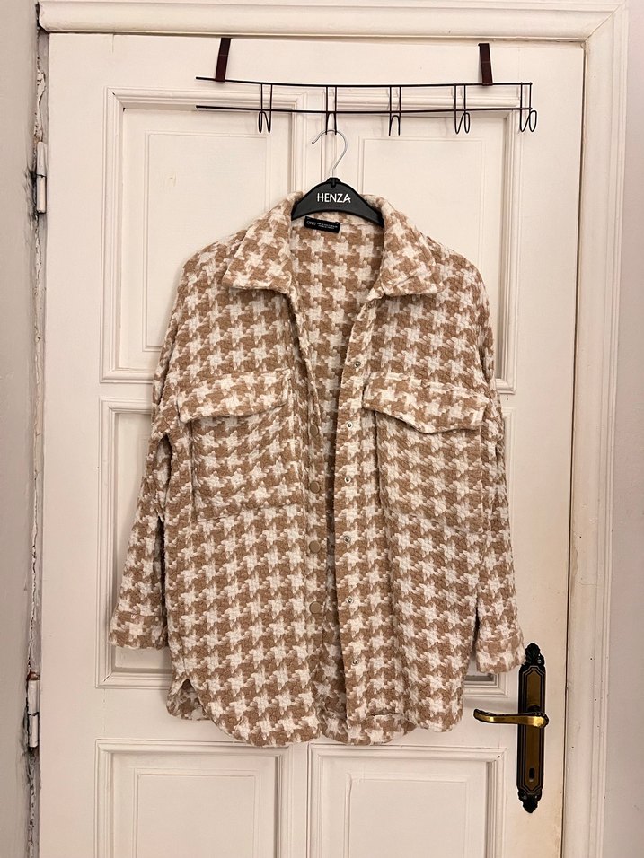 Düğmeli, uzun kollu, kahverengi kadın gömleği. Hafif yılan desenli, yumuşak yün kumaştan, günlük kullanıma uygun.