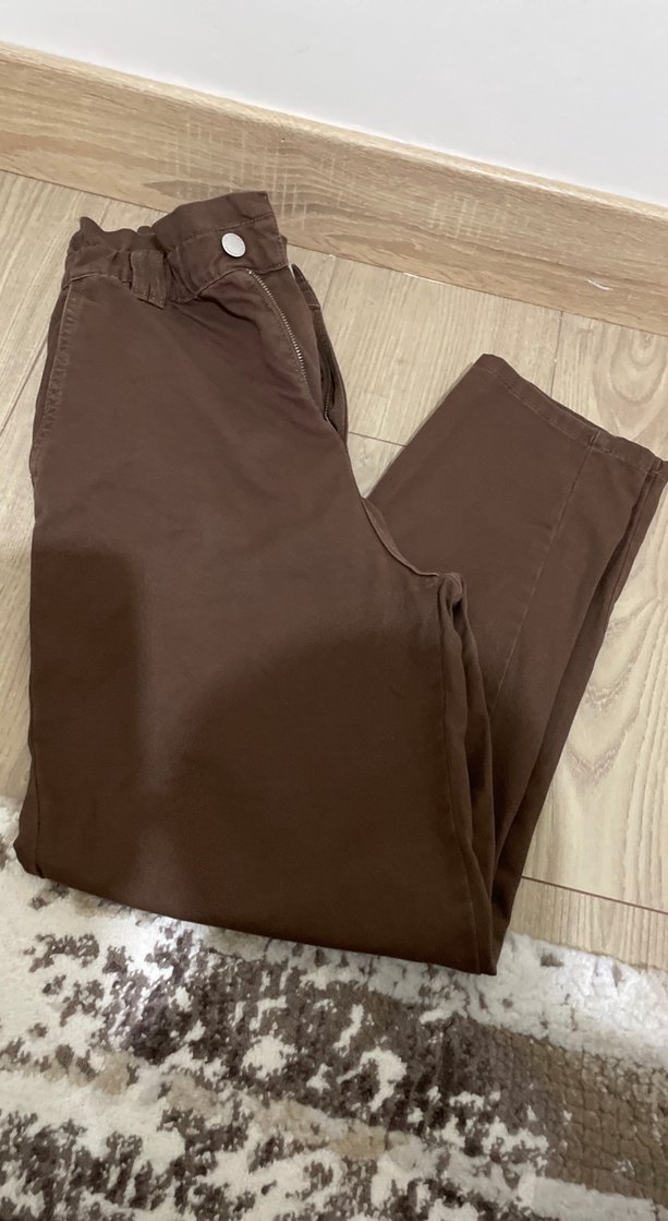 Yumuşak kumaştan yapılmış, düğmeli kahverengi, bol kesim kadın pantolonu, günlük kullanım için rahat sokak stili.